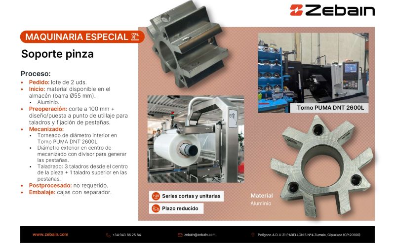 Zebain ha desarrollado recientemente un proyecto centrado en la fabricación de un soporte de pinza en aluminio, una pieza que pone de manifiesto la capacidad de la empresa para afrontar trabajos de mecanizado con series cortas y requisitos técnicos específicos.